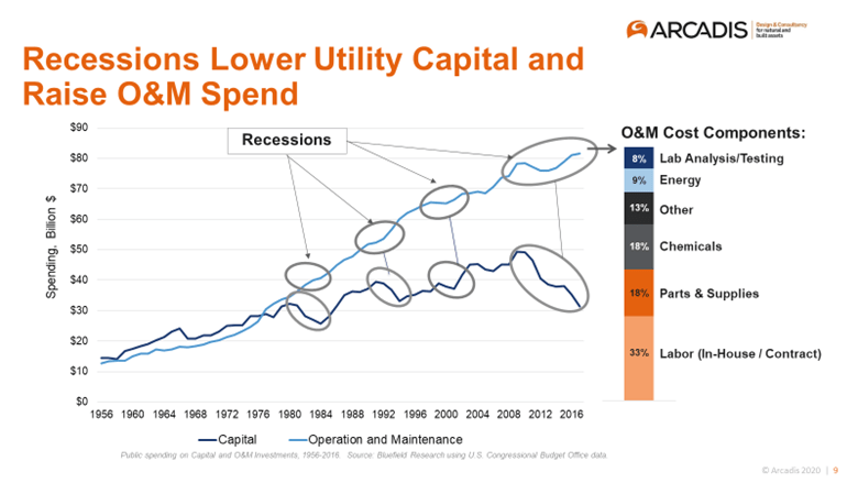 I can’t say there’s much value to be found in COVID-19, except that it might be the catalyst the water sector needed to start realizing Intelligent Water’s benefits. We came into 2020 already facing an affordability crisis. The pandemic triggered a slight recession, and spiking infection rates could make economic waves again. If they do, utilities must consider how recessions have affected operations and maintenance (O&M) spend in the past.