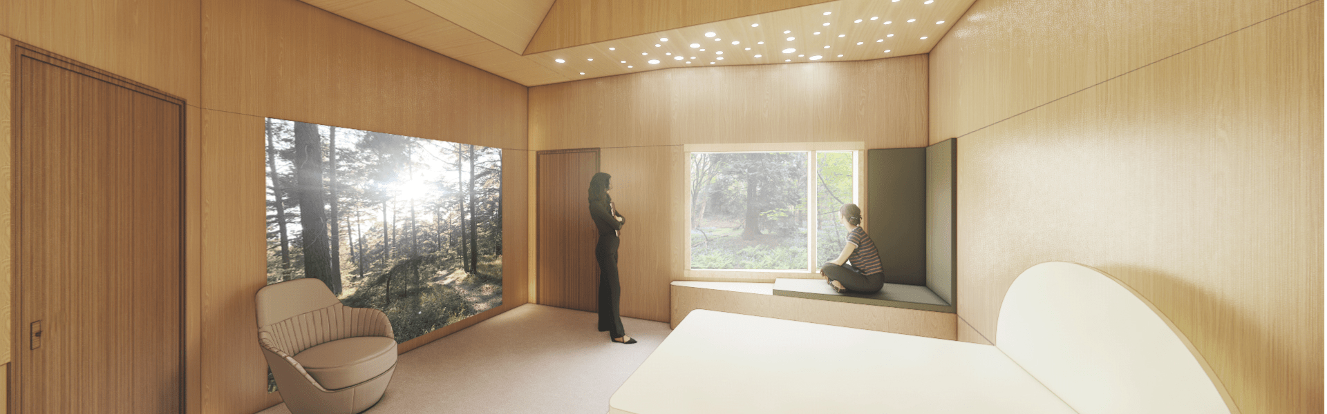 Dual, symmetrical, pitched roofs are domestic in scale giving a less institutional feel. Horizontal lines in design have been known to promote calm, tranquility and trust which is reflected throughout. The limited architectural palette is simple to understand visually with natural finishes such as wood and natural stone pattern. Wood in particular is an important material providing an organic tactile experience, the grains and organic patterns in wood reflect back to our evolutionary past having a soothing effect on our wellbeing whilst providing a mindful experience of the present moment5. Real wood panelling in areas such as the public spaces and robust wood effect panelling in patient bedrooms could provide sanctuary, fostering psychological comfort.