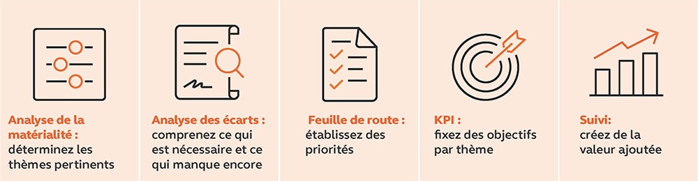 Que pouvez-vous faire dès maintenant en tant qu'entreprise ? La première étape consiste à déterminer les thèmes prioritaires pour votre entreprise grâce à une analyse de la matérialité. Ensuite, il est important de comparer vos mesures de gestion actuelles et votre rapportage aux exigences de la CSRD. Que faites-vous déjà ? Qu'est-ce qui est attendu de vous ? Qu'est-ce qui manque encore ? Ce résultat forme la base d'un plan d'action qui définit les priorités pour votre entreprise. Lorsqu'il y a encore des actions nécessaires, des objectifs clairs et des indicateurs clés de performance (KPI) sont définis pour chaque thème. Dans la dernière étape, vous suivez ces KPI de près. Arcadis peut vous accompagner dans toutes ces étapes et vous aider à transformer ces obligations intensives en une véritable valeur ajoutée pour votre entreprise.