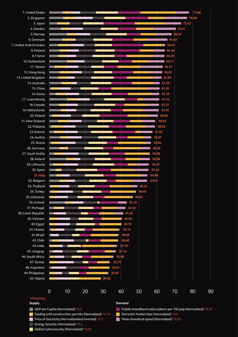Nello scegliere dove porre le fondamenta del nuovo data center le aziende devono considerare due variabili significative: l'infrastruttura e il regime normativo esistenti, nonché la domanda attuale e quella potenziale futura di dati. Fatta eccezione di alcuni paesi in classifica, generalmente ogni stato ha un rating alto in una sola delle due. Molte nazioni ricche godono di servizi di elettricità consolidati e politiche favorevoli ma generalmente non sono questi i mercati con le maggiori prospettive di crescita. Allo stesso modo rappresentano di frequente la porta d’ingresso delle grandi piazze internazionali come l'Unione Europea. Alcuni paesi in via di sviluppo invece, mostrano un margine più alto di miglioramento sia nell’offerta di un processo amministrativo snello in grado di far ottenere velocemente i permessi, sia in termini di sicurezza energetica e cybersecurity.