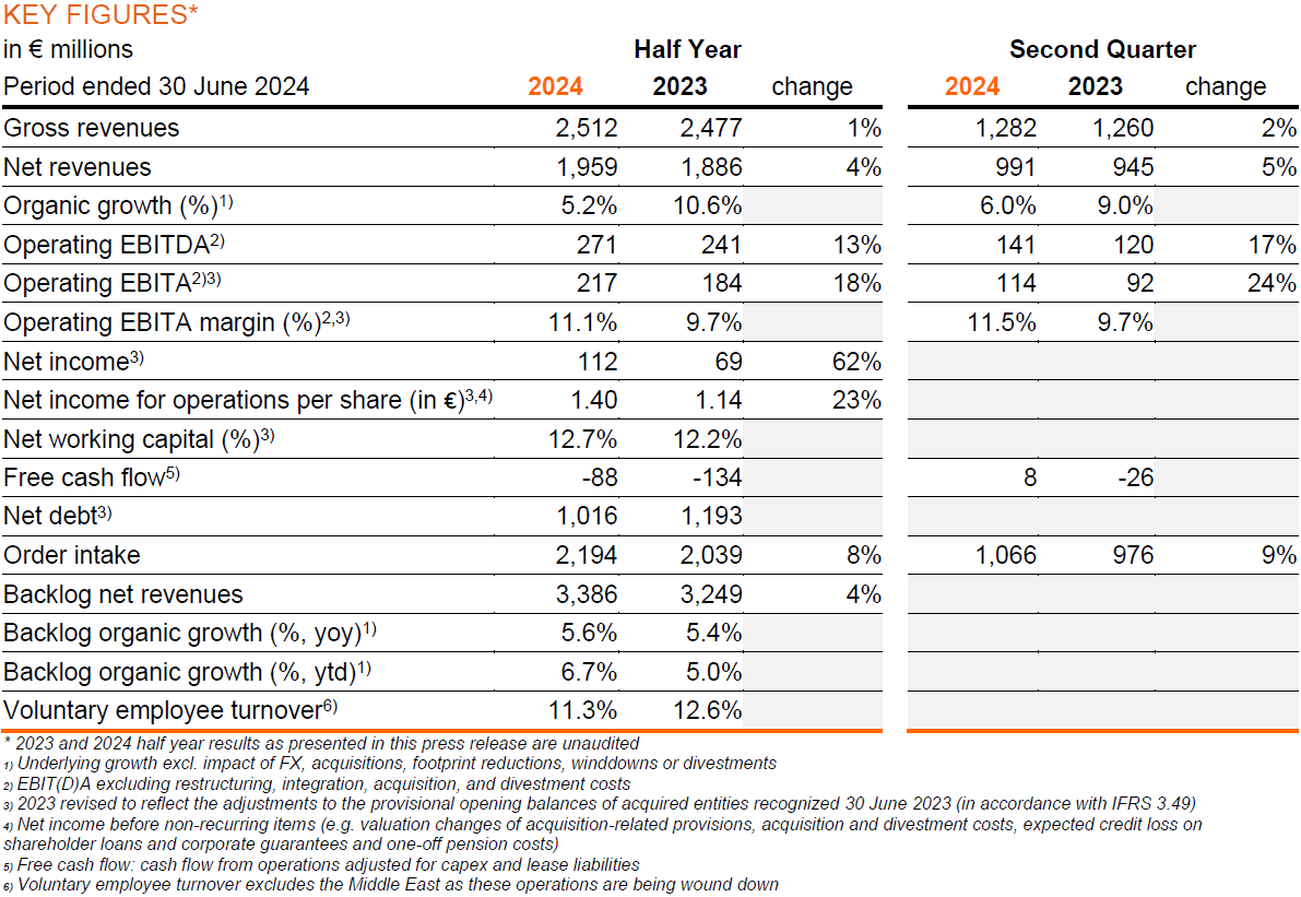 Alan Brookes, CEO Arcadis, said: “Arcadis has delivered a strong first half year of its strategy cycle 2024-2026. Sustained client demand across all our Global Business Areas and specifically in solutions across Energy Transition, Water, Technology and Mobility resulted in strong revenue growth and order intake in the quarter. Operating leverage, an improved project portfolio and cost control allowed us to further improve our margin and deleverage our balance sheet. Meanwhile, we achieved the first milestones in our strategy implementation through the roll out of our Skills Powered Organization, the advancing of the Arcadis Energy Transition Academy and expansion of the Global Excellence Centers. Our deep asset knowledge, global expertise and complementary set of services are key success factors allowing us to further drive continued profitable growth and to better serve our clients.”