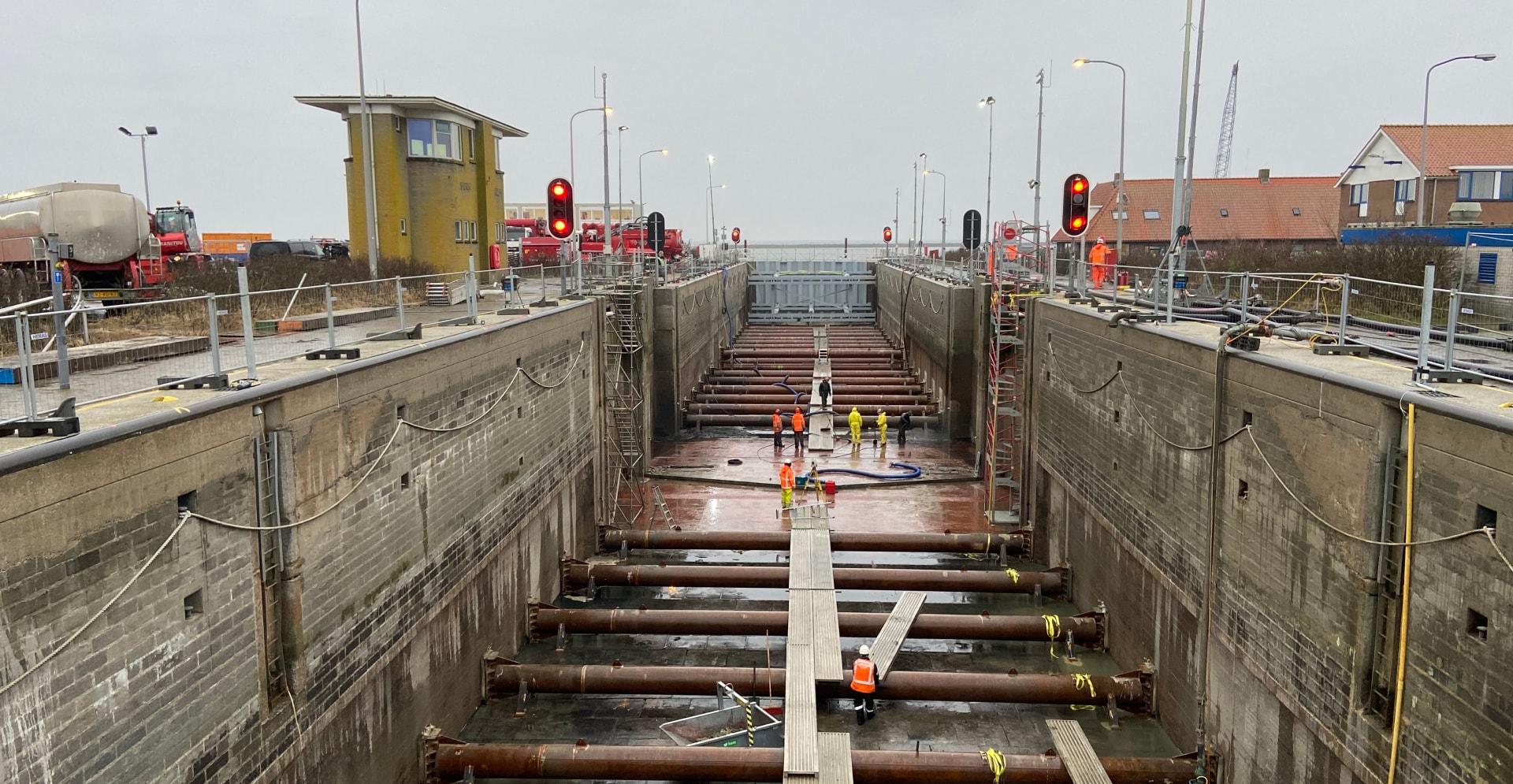 Waarschijnlijk staan de Stevinschutsluizen voor het eerst in 90 jaar droog. Voor dit project ben ik gevraagd om de stabiliteit van de sluiswanden tijdens droogzetten te controleren. Om stabiliteit van de kolkwanden te waarborgen, zijn er stalen stempels op de vloer tussen de sluiswanden geplaatst. Zware groutzakken drukken de stempels nog eens extra stevig tegen de wanden. Groutzakken zijn zakken gevuld met beton. Pas als de laatste stempel staat, zet het team de sluizen droog en kunnen de onderhoudswerkzaamheden starten. Ze maken het complex slibvrij en schoon en voeren de inspectie uit. De sluizen blijken in topconditie te zijn. Het rood-bruine metselwerk als vloer van de sluishoofden lijkt zo goed als nieuw. Specialisten voeren enkele betonreparaties uit en de bestaande sluisdeuren worden opgeknapt. Op deze manier verlengen we de levensduur van de sluizen.