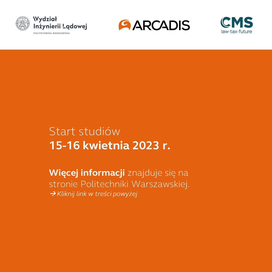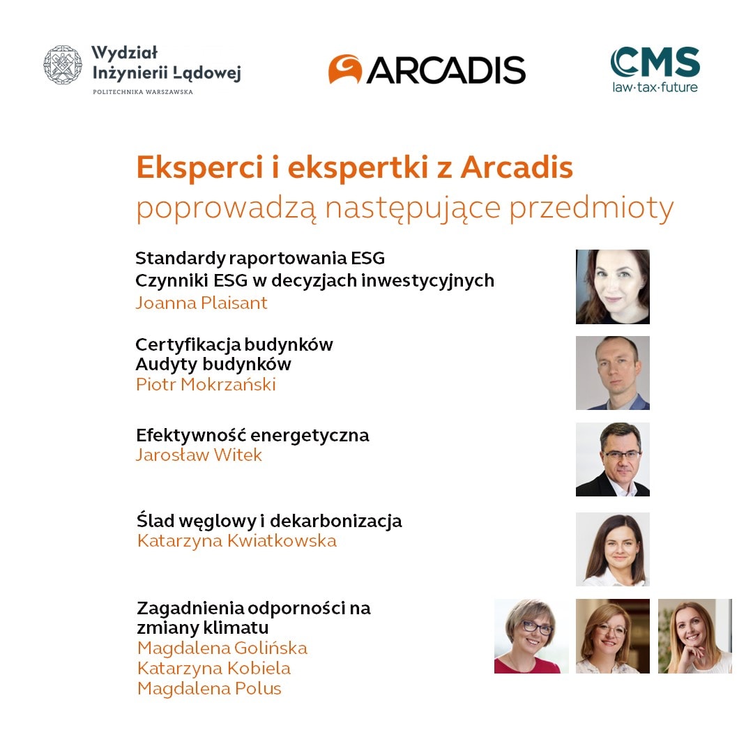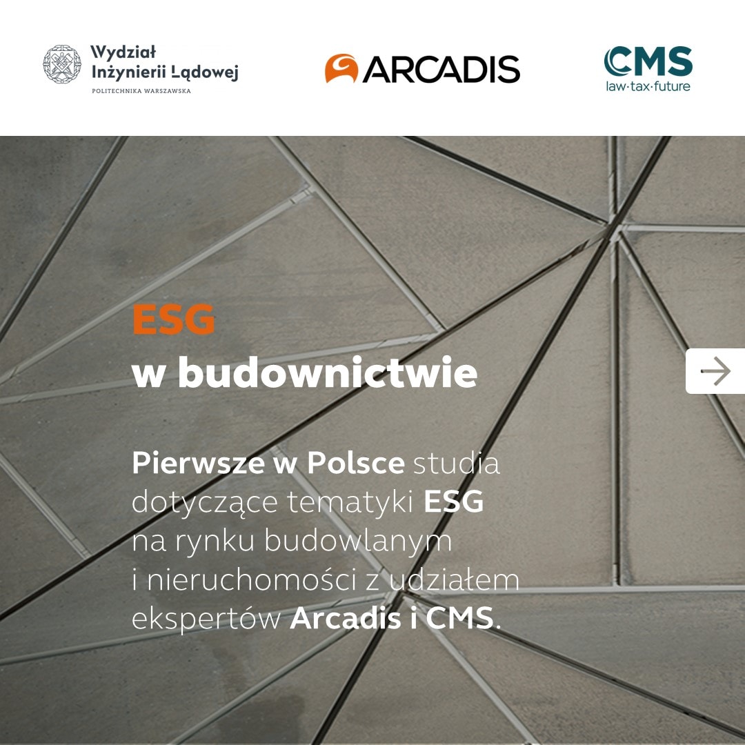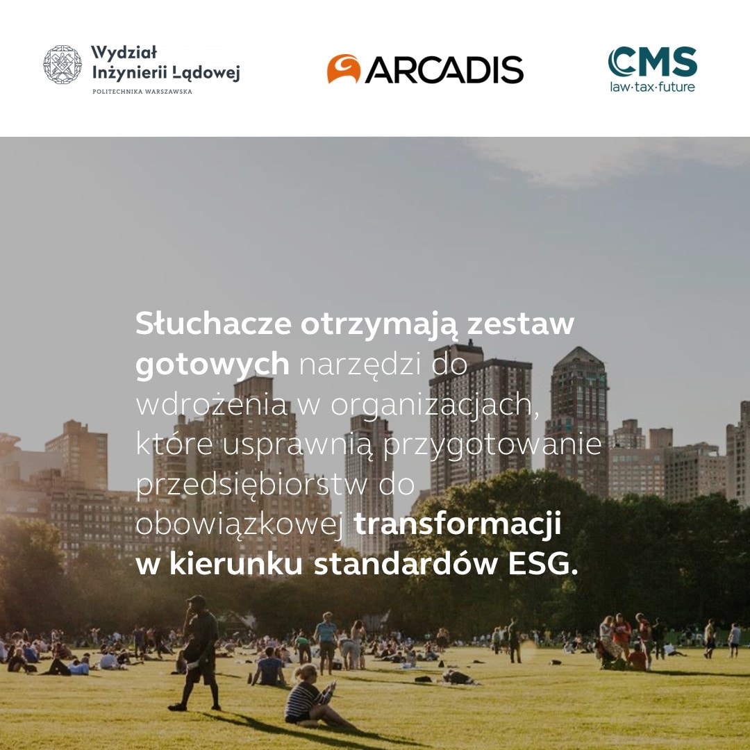ESG w Budownictwie to nowy kierunek studiów podyplomowych na Wydziale Inżynierii Lądowej Politechniki Warszawskiej. Studia zostały stworzone w konsorcjum: Wydział Inżynierii Lądowej przy współpracy z Arcadis i kancelarią CMS.